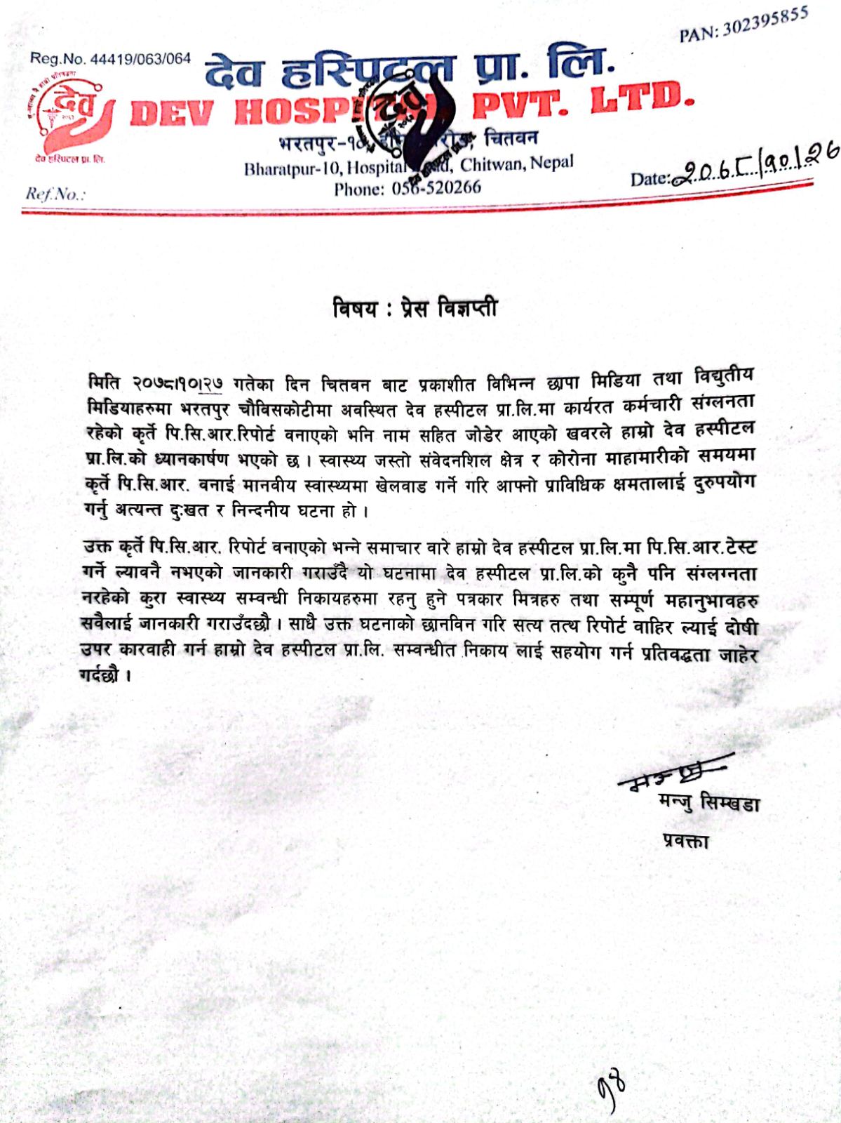 बिगत २ दशक देखि हामी देव हस्पिटल प्रा. लि. परिवार हजुरहरूकाे सेवामा निरन्तर रूपमा लागिरहेका छाैँ । चितवन मै उत्कृष्ठ अस्पतालकाे रूपमा उभिदै गर्दा गुणस्तरिय सेवामा कुनै कमि कमजाेरी नहुने हामी प्रतिबद्धता गर्दछाैँ । "सु-स्वास्थ्य नै हाम्राे प्रतिबद्धता" मूल नारालार्इ सार्थक बनाउँदै अागामी दिनहरूमा हजुरहरूकै सेवामा समर्पित हुँदै चितवनकाे नमुना अस्पतालकाे रूपमा चिनाउने लक्ष्य राखेका छाैँ ।